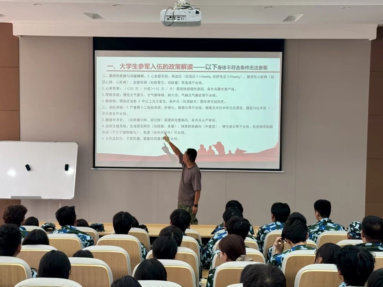 讲座伊始,王啟龙便聚焦国家征兵政策的最新调整,结合2025年征兵工作的新要求、新变化,用清晰的条理为新生们梳理政策要点。他指出,近年来国家高度重视大学生征兵工作,不断优化政策支持,为大学生参军入伍提供了更多便利与保障,鼓励新生们把握时代机遇,积极响应国家号召。