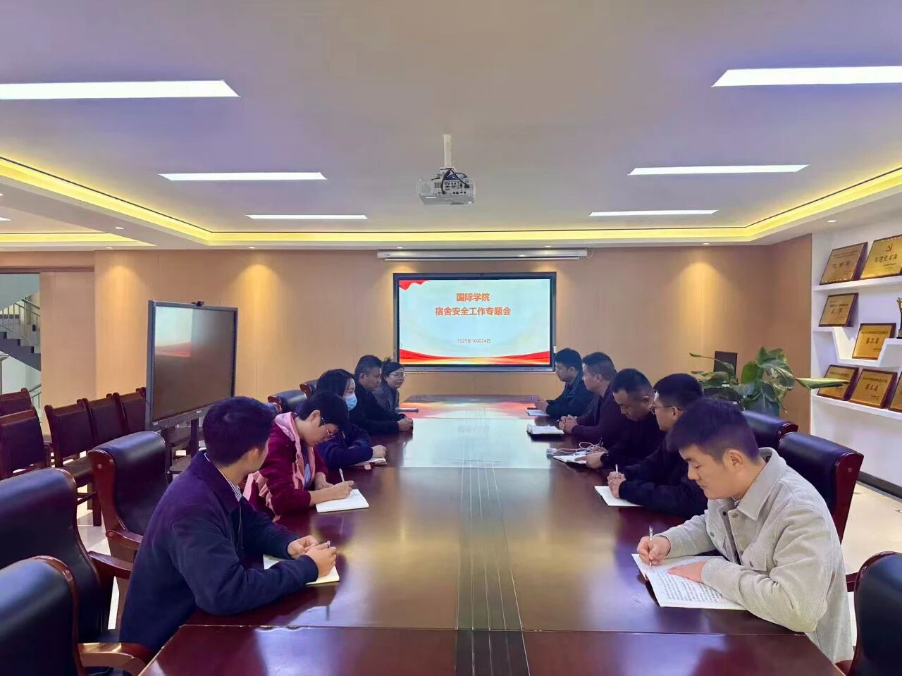 为进一步强化宿舍安全管理,消除安全隐患,营造整洁、安全、和谐的学生居住环境,10月24日,国际学院于304会议室召开宿舍安全工作专题会。行政办主任罗红磊、医护部副主任赵江涛及全体辅导员参加会议,会议由赵江涛主持。
