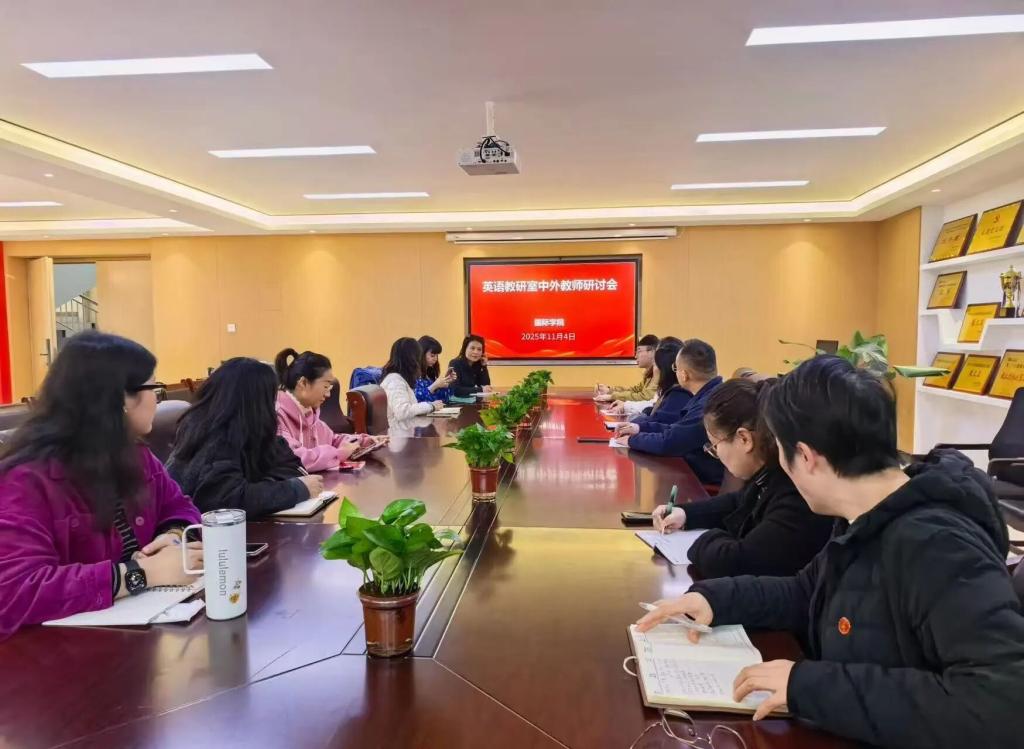为深入贯彻落实学院“提质增效”的教学工作要求,全面提升英语学科教学质量与育人实效。11月4日,英语教研室精心组织的中外教师研讨会在会议室顺利召开。本次研讨会特邀经验丰富的外教 Sandro 莅临分享,教研室全体教师齐聚一堂,围绕“教学方法创新、教学管理规范、学生核心素养培养”三大核心议题,展开了一场务实高效、干货满满的深度交流。