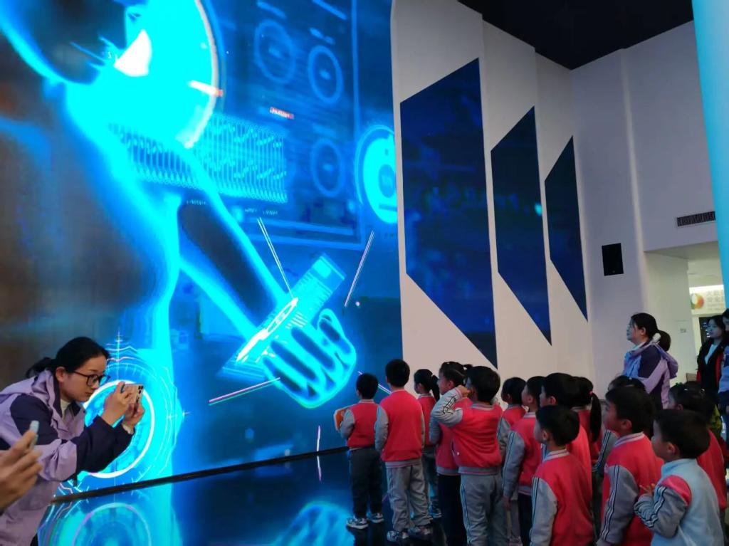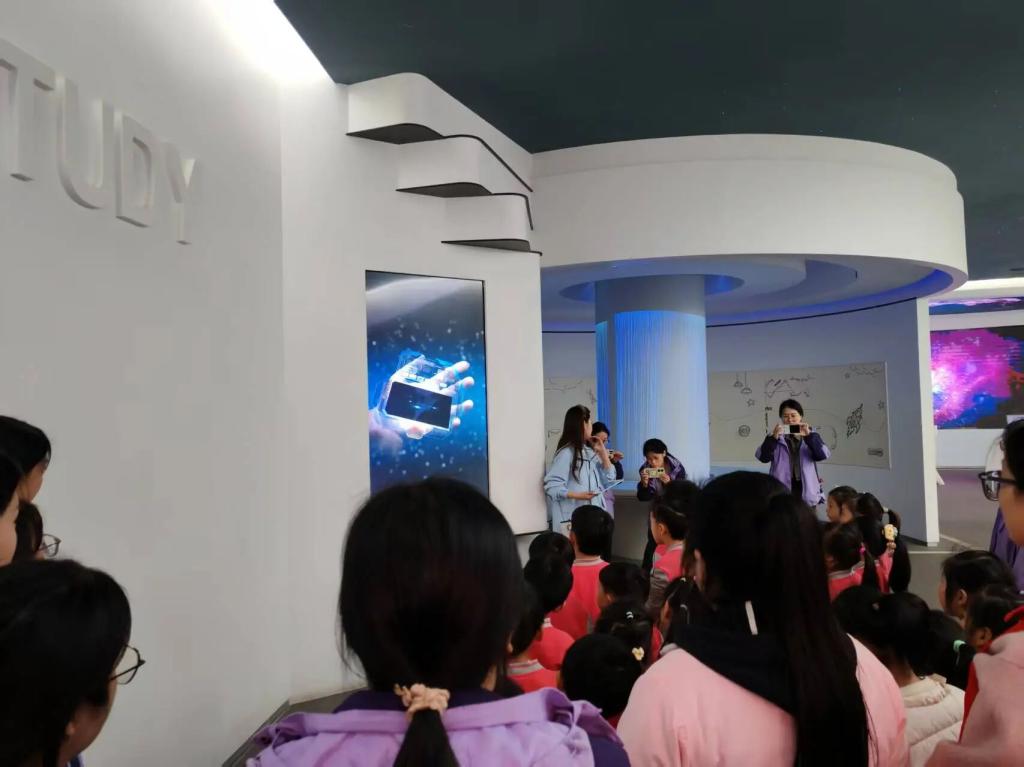 以智慧馆3500㎡展教空间、1000余件展品为依托,专业师生全程陪伴孩子们探索,把抽象网络技术知识融入每一个互动环节。智慧教育展厅里,师生手把手教孩子们操作空间站模拟装置,耐心讲解屏幕上的网络信号传输路径;佩戴HoloLens设备时,细心帮孩子们调整佩戴位置,引导他们观察全息影像中的数字世界。网络安全互动区,师生用卡通动画演示黑客改号的原理,通过“找不同”“答问题”小游戏与孩子们互动,答对的小朋友还能获得师生准备的小贴纸奖励,在欢乐中提升反诈认知。
