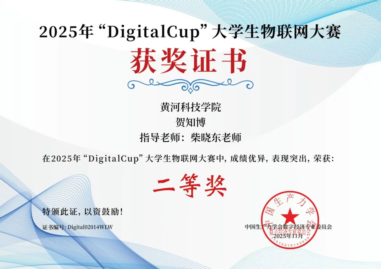 11月30日,由中国生产力学会数字经济专业委员会指导、国家一级学会主办的2025年度"DigitalCup"全国大学生人工智能大赛物联网赛道总决赛圆满落幕。国际学院2024级计算机网络技术专业学生贺知博凭借扎实的专业功底和出色的临场发挥,从全国顶尖高校选手中脱颖而出,荣获全国二等奖。