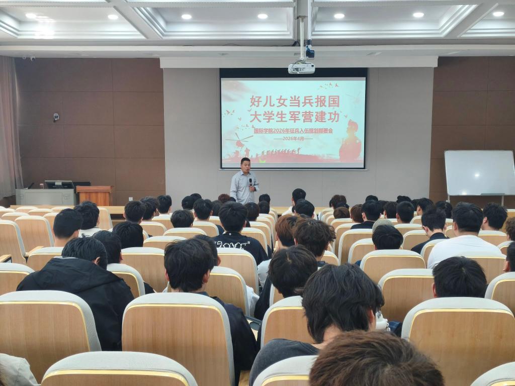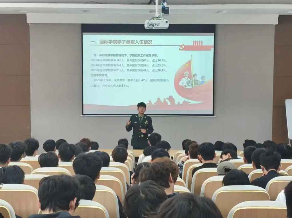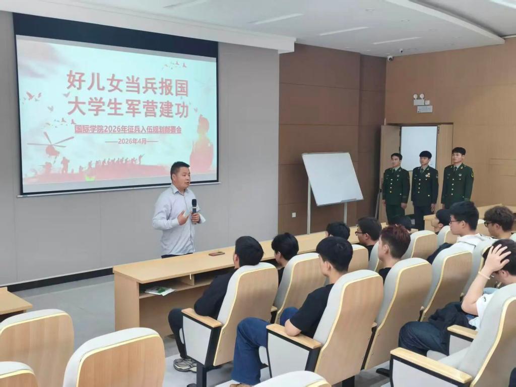 为扎实推进2026年大学生秋季征兵入伍工作,明确工作方向、细化任务分工,切实激发全院学子参军报国的热情。27日中午,国际学院在阶梯教室一召开2026年秋季征兵入伍工作规划部署会。会议由行政办主任罗红磊主讲,专武干部王啟龙老师主持。