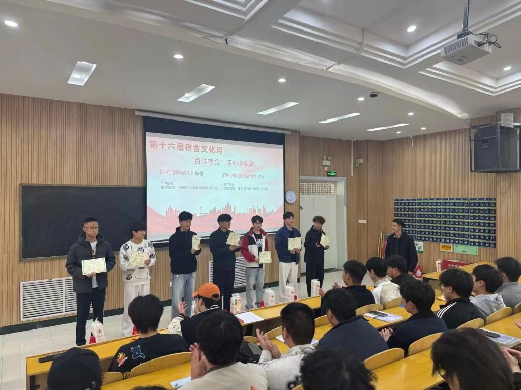 此外,在第十六届宿舍文化月系列活动中,多个宿舍和个人凭借出色的表现斩获荣誉:在“宿舍楼宇命名征集”活动中,202宿舍荣获优秀奖,207宿舍荣获三等奖;在“宿舍安全海报设计”活动中,220宿舍吕金俊、429宿舍刘勃浩、410宿舍郭琪荣获优秀奖;510宿舍获评“百佳学风宿舍”,607宿舍获评“百佳模范党员宿舍”。郭旭东为其颁奖。