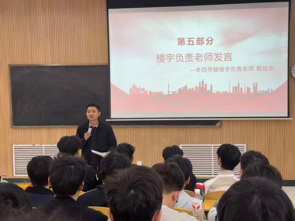 会议最后,郭旭东发言,对全体宿舍长的辛勤付出表示肯定与感谢。他指出,宿舍是同学们在校学习生活的重要场所,是校园文明建设的关键阵地,而宿舍长作为宿舍的核心带头人,肩负着服务同学、管理宿舍、传递信息的重要职责。老师强调,安全是宿舍管理的底线,各位宿舍长要时刻绷紧安全这根弦,带头遵守宿舍安全管理规定,主动排查身边安全隐患,坚决杜绝违规用电、晚归不归等行为;要当好宿舍的“管理员”,带头做好内务卫生,带动室友养成良好生活习惯,营造整洁舒适的住宿环境;要当好同学的“联络员”与“调解员”,积极反馈同学诉求。同时,老师希望各位宿舍长强化责任担当,发挥模范带头作用,以责任心、耐心和热心做好宿舍各项工作,携手共建团结友爱、积极向上的宿舍氛围。