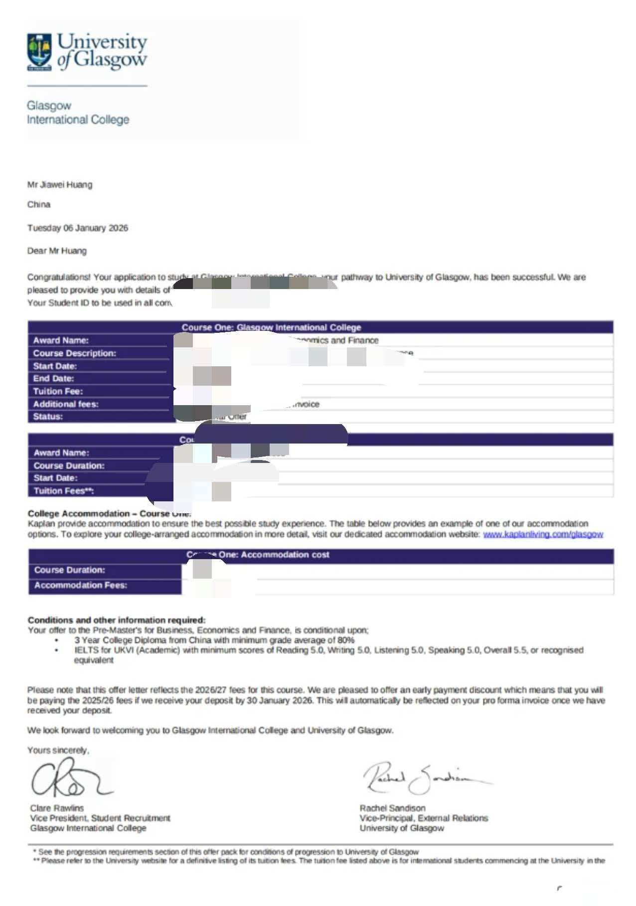 黄家炜,男,黄河科技学院国际学院23级电子商务专业,分别收到英国格拉斯哥大学、谢菲尔德大学双校offer,顺利拿到录取通知,被国际商务专业录取。